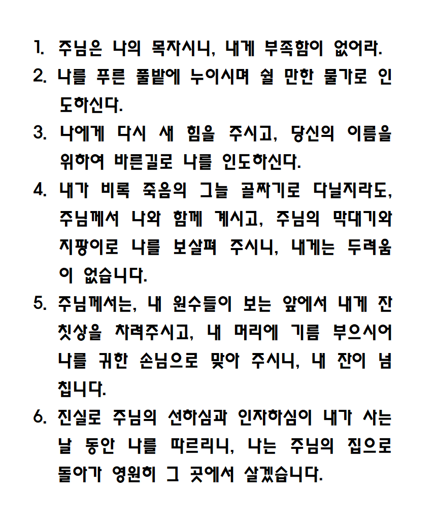 1. 주님은 나의 목자시니, 내게 부족함이 없어라.